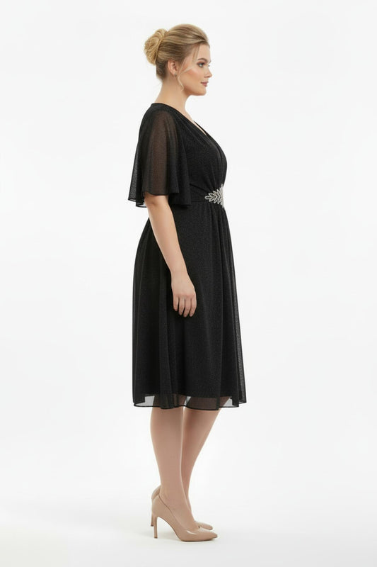 Große Größen: Midikleid Aus Glitzerndem Tüll Mit Steinbesetzter Taille – Schwarz