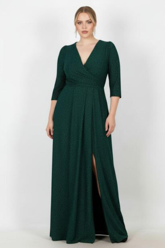 Plus - Size Long Glitter Evening Dress With Elbow Sleeves — Emerald