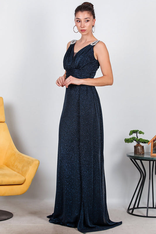Sparkle Maxi Evening Dress With Shoulder Detail — Navy