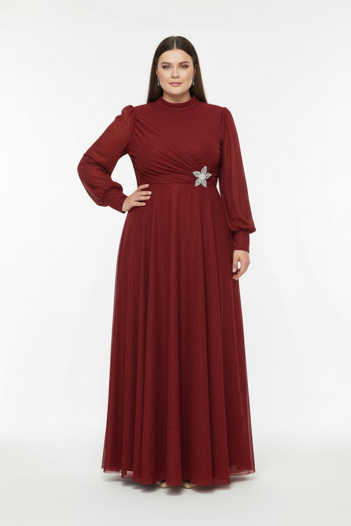 Büyük Beden Beli Aksesuarlı Pliseli Uzun Abiye Kırmızı